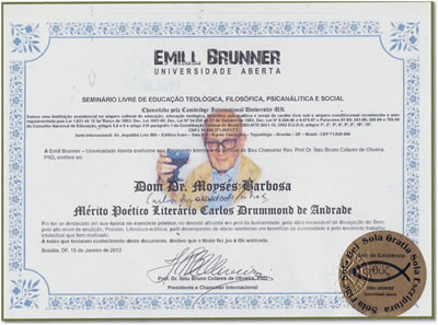 +Dom Moysés sente-se muito honrado e agradece a Universidade Emill Brunner, de Brasilia, e a seu Diretor e Chanceler Internacional, Prof. Dr. Italu Bruno Colares de Oliveira.