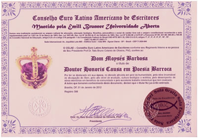 To our knowledge, Dr. Moyses Barbosa, dean of the ancients Brazilian poets, is the only one that has this distinction, along with the dozens of titles of Doctor Honoris Causa you have in different other areas of knowledge.