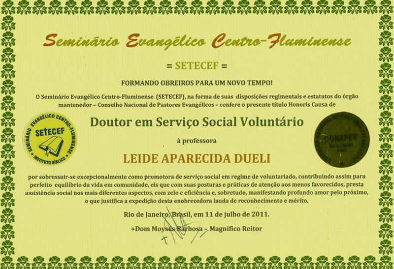 The Diplomações have been issued by the Evangelical Seminary Central-Fluminense, agency maintained by the Council and what is the Rector +Don Moyses Barbosa, who signed the certificates.