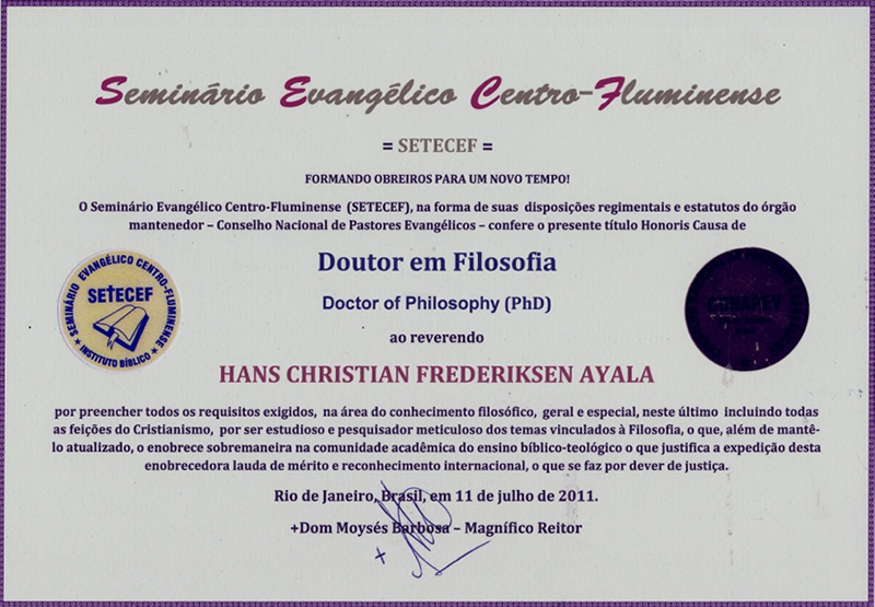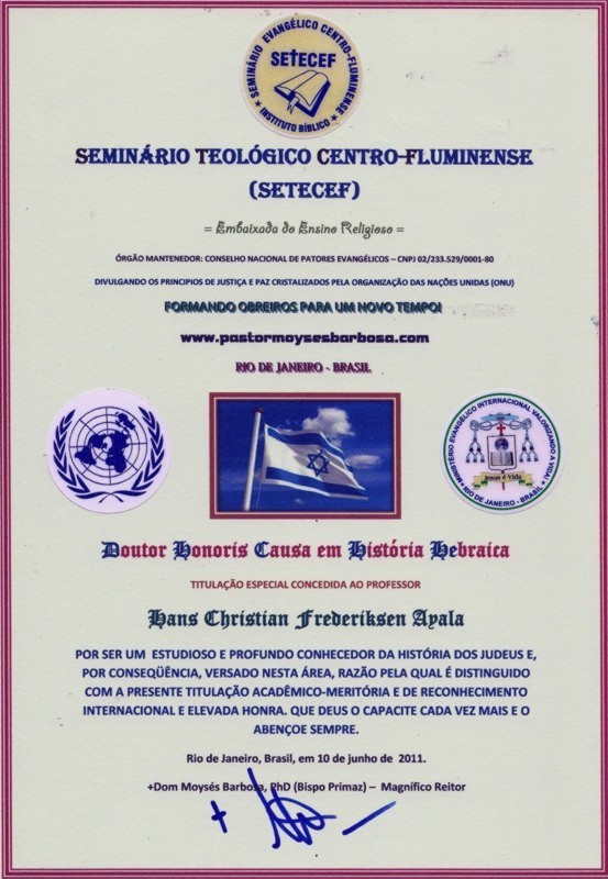 Four months after recognition, the Theological Seminary Central Fluminense (SETECEF), maintained by CONAPEV awarded Dr. Hans Frederiksen titration of Doctor Honoris Causa in Hebrew History.