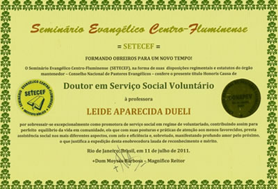 Two persons were honored in Bolivia, on July 11, 2011: Dr.ª Leide Aparecida Dueli, awarded the title of Honorary Doctor of Social Work Volunteer and Professor Hans Christian Frederiksen Ayala, head of the Hebrew Theological Seminary, both working in the city of Santa Cruz.