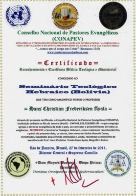 On February 27, 2011, in plenary session, under the direction of +Don Moyses Barbosa, the National Council of Evangelical Pastors - CONAPEV recognized the Hebrew Theological Seminary, located in Bolivia, which gives it more credibility, which acts as a business card, especially for the Evangelical Community of Brazil.